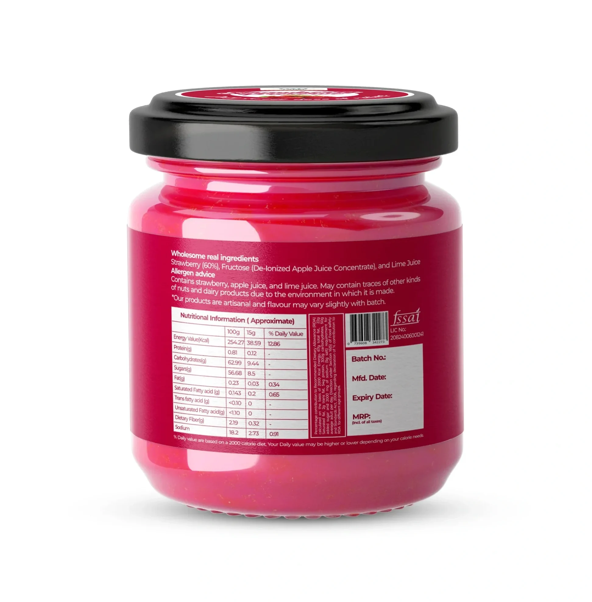 Ingredients: Strawberry (60%), Fructose (De-lonized Apple Juice Concentrate), and Lime Juice